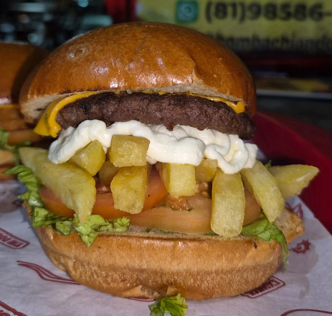 Pão Brioche, 2 Carnes Artesanais de 100g, 2 Fatias de queijo, Cream cheese, Batata Frita e verdura.
